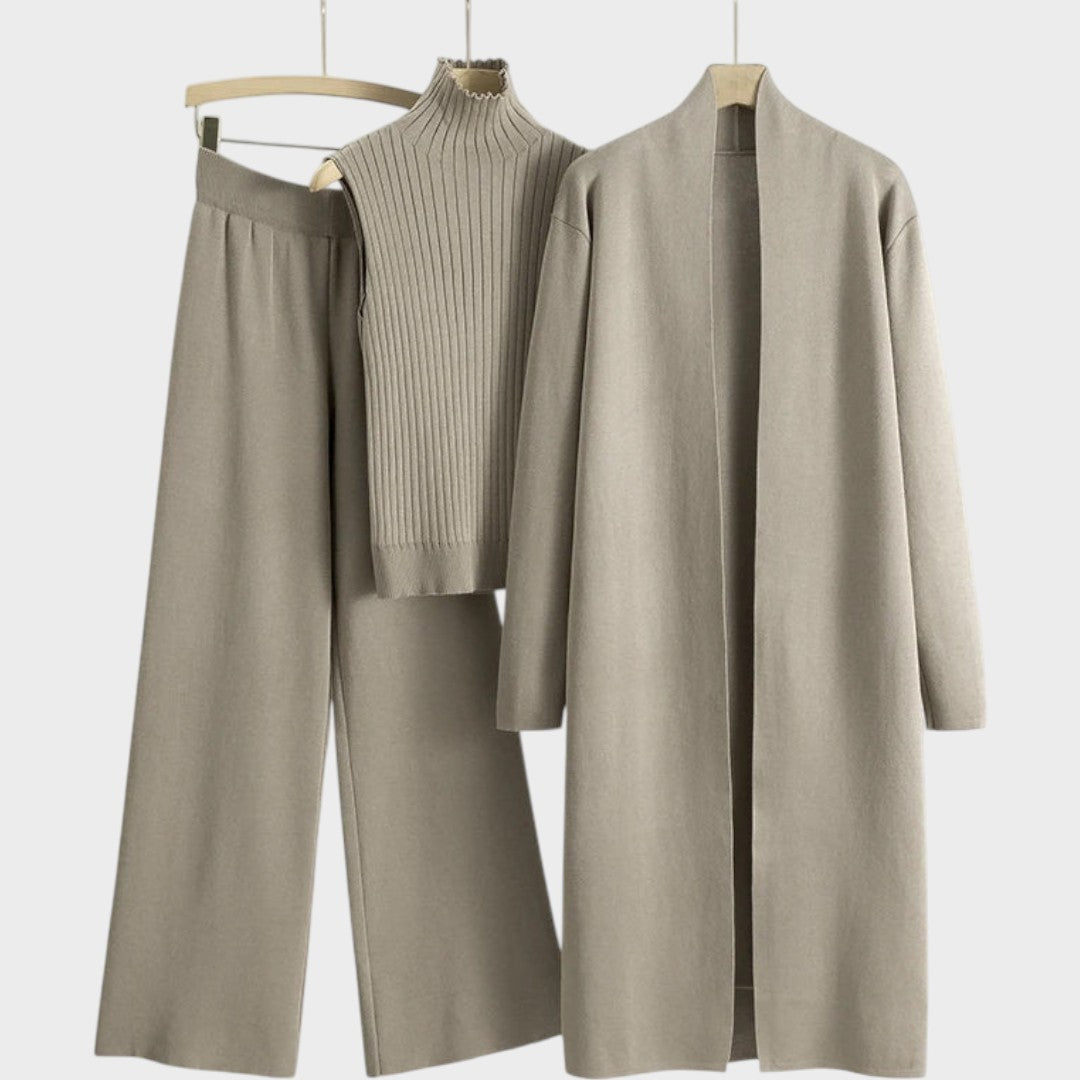 El conjunto Olivia fue creado para quienes buscan elegancia discreta y comodidad absoluta en el día a día. Consta de tres prendas básicas y versátiles que combinan a la perfección, pero que también brillan por sí solas. El cárdigan largo y abierto crea una silueta alargada y sofisticada, ideal para añadir un toque de elegancia a tu look. El jersey de cuello alto sin mangas con textura acanalada ofrece la calidez y el encanto perfectos, perfecto para la temporada. Los pantalones anchos completan el conjunto con comodidad, fluidez y un ajuste impecable.