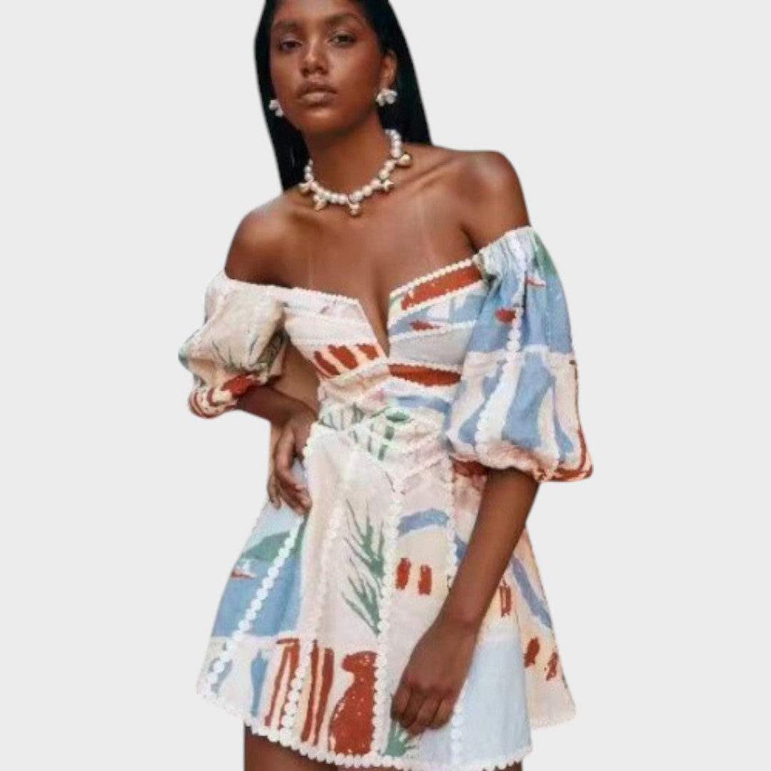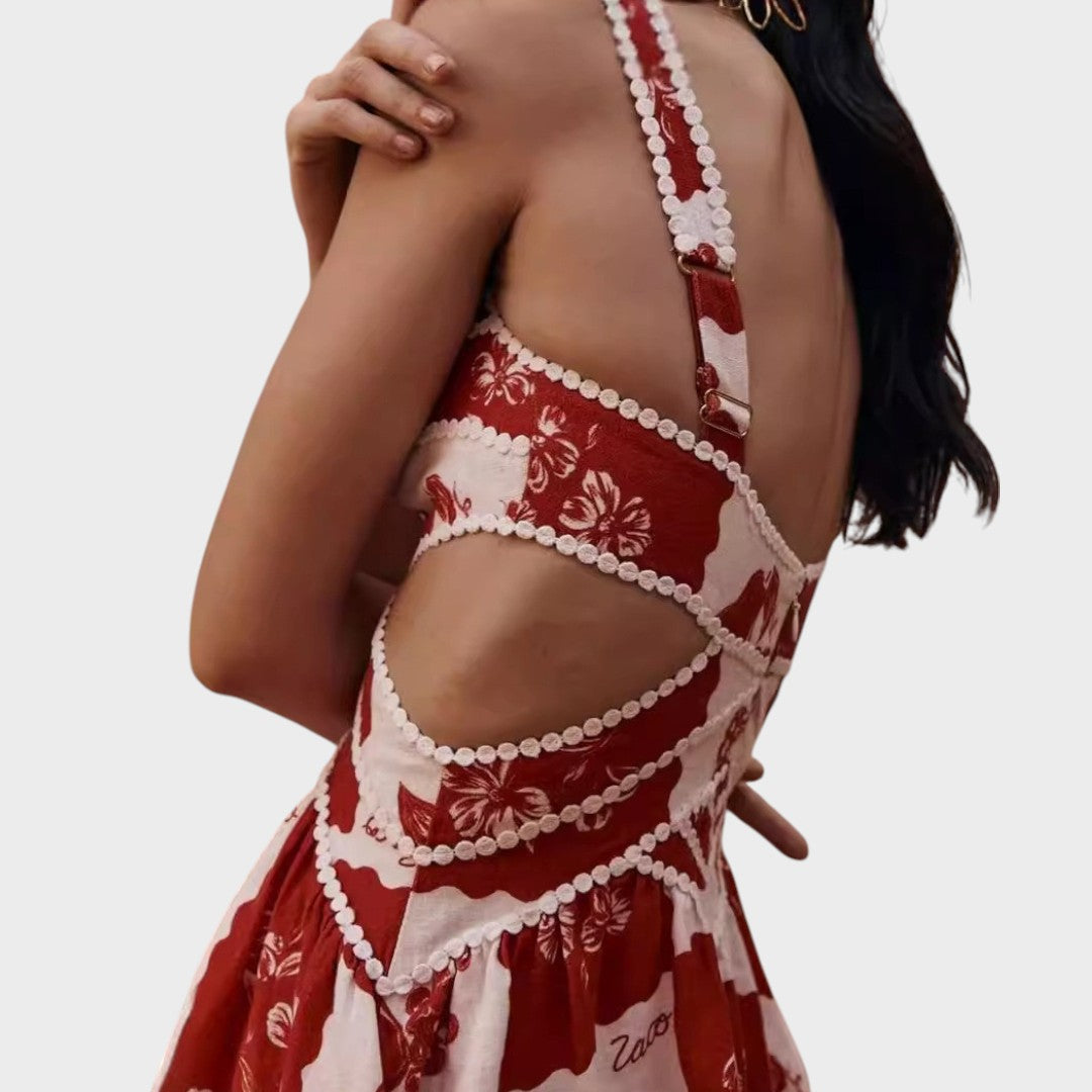 El vestido Sabella destaca por su atrevida estética boho-chic. El corte estructurado, con escote en V y laterales abiertos, realza la silueta de forma sensual y elegante a la vez. Los detalles de ganchillo blanco añaden un toque artesanal, mientras que el estampado floral le confiere un moderno aire vintage. Ideal para días de verano, escapadas románticas o festivales.