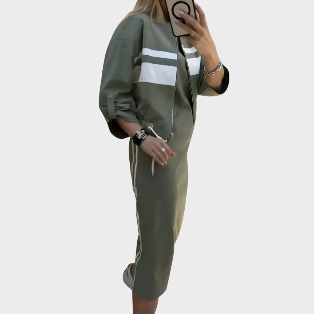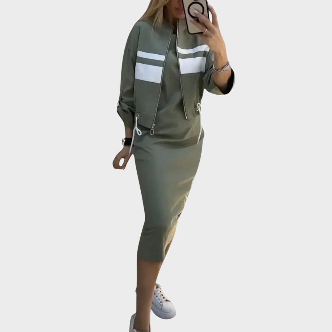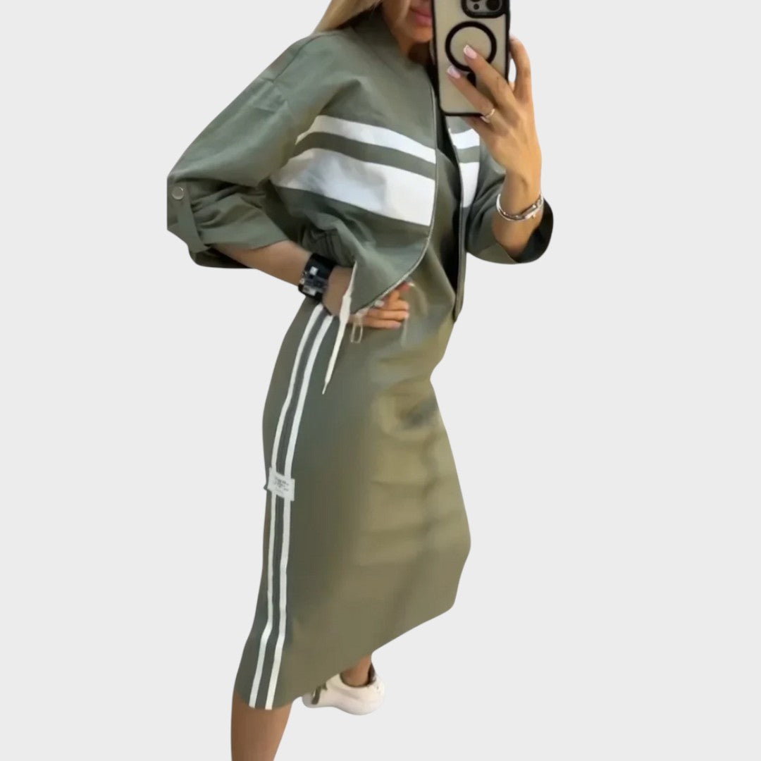 Mejora tu look diario con este elegante conjunto de dos piezas que combina comodidad deportiva y estética moderna. Compuesto por un top con cremallera y cordón ajustable y una falda midi a juego, es la opción perfecta para un look sofisticado y relajado. Ideal para salidas urbanas, viajes o momentos de relax de fin de semana.